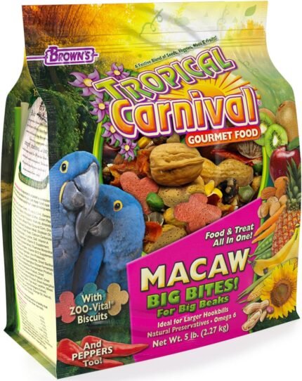 Price: (as of – Details) Product Description F.M. Brown’s Tropical Carnival, Gourmet Macaw Food Big Bites for Big Beaks, is