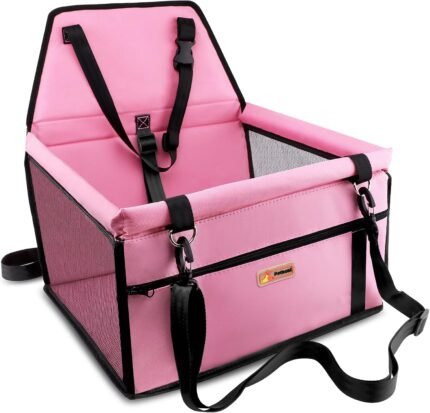 Petbobi Pet Reinforce Car Booster Seat for Dog Cat Portable and Breathable Bag with Seat Belt Dog Carrier Safety Stable for Travel Look Out,with Clip on Leash with PVC Tube, Pink