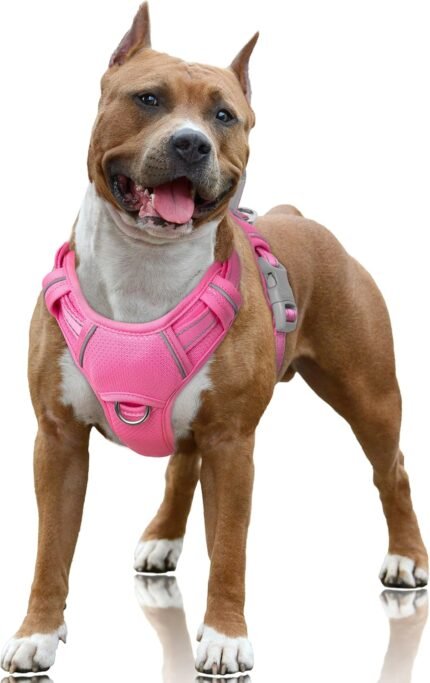 BARKBAY No Pull Dog Harness Large Reflective Dog Harness with Front Clip and Easy Control Handle for Walking Training Running with ID tag Pocket(Pink,L)